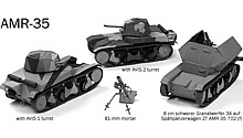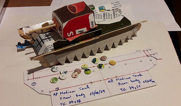 After having released the AMR-35 booklet I decided to make a larger tank. The choice of "hole punch"-based road wheels made me consider the Churchill, also in the "Black Prince" version, and the LVT. I started development on the British A7E3 prototype from 1936 but was faced with issues on the hull structure. |